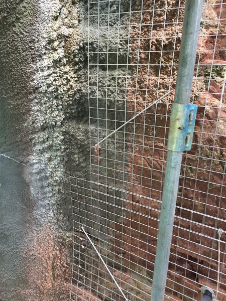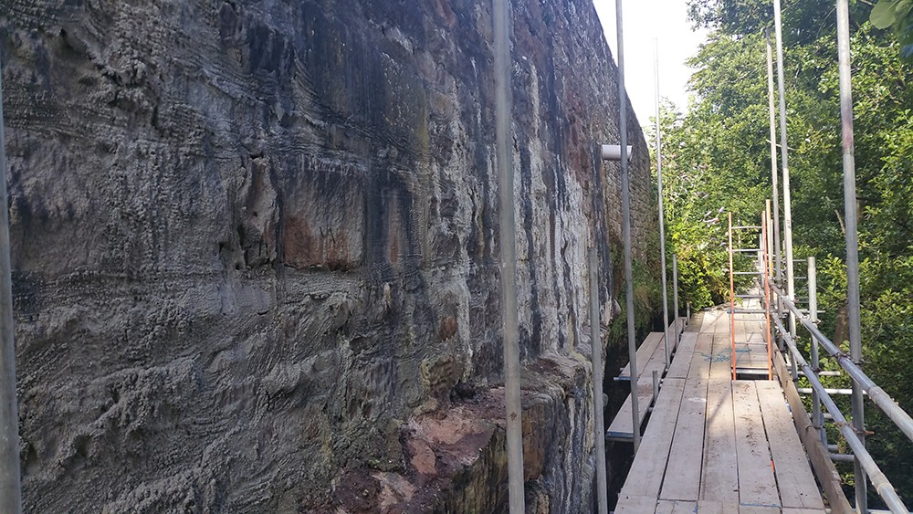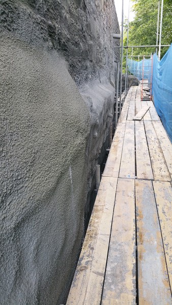 The initial stage of the repairs required the removal of surrounding vegetation and the installation of scaffolding access, before preparing the surfaces of the rock face through a process of pressure washing. ‘Weep holes’ were then cored into the rock face and perforated PVC pipes were installed, in order to create ‘weep pipes’ throughout the wall. Stainless steel mesh fabric was then fixed over the face of the rock before dry sprayed concrete was applied, up to a maximum thickness of 150mm, to follow the contours of the rock face.