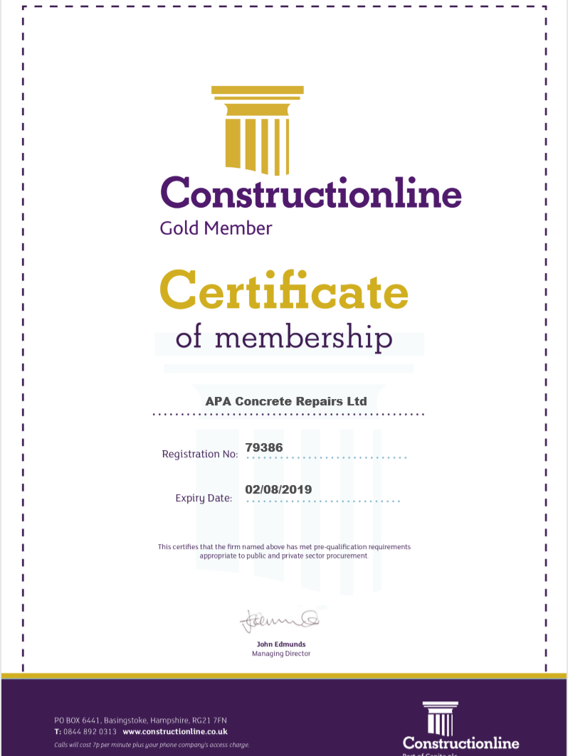 APA Concrete Repairs Ltd are proud to have achieved the Gold standard membership for Construction Line!